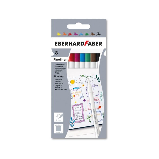 The fineliner in a modern square design impresses with intense colours. The metal-clad tip ensures a long lifespan. The 0.4mm line width is ideal for drawing, writing, and colouring and is also suitable for rulers and templates. The cap is attachable to the end of the pen. The non-slip grip zone provides a good grip and makes the fineliner the perfect companion for school, college, everyday life, or creative moments. The fineliners are available in two packaging sizes with 8 and 16 pieces.